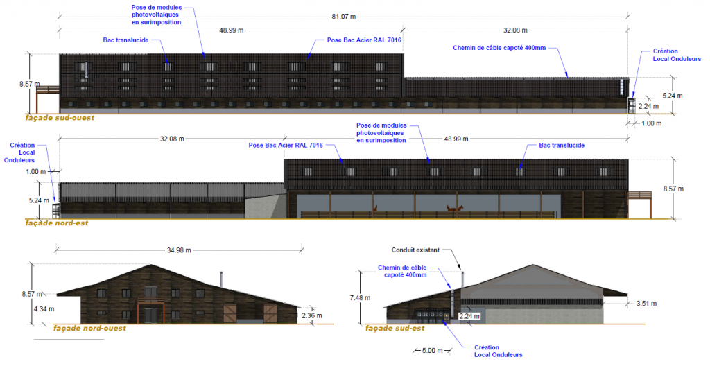 Les solutions photovoltaïques proposées aux exploitations et aux collectivités permettent de répondre à leurs besoins de développement, comme un bâtiment de stockage, une stabulation, un centre équestre ou un bâtiment communal. Enfin, une étude spécifique au cas par cas est menée afin d’adapter le projet solaire au besoin et à son environnement.