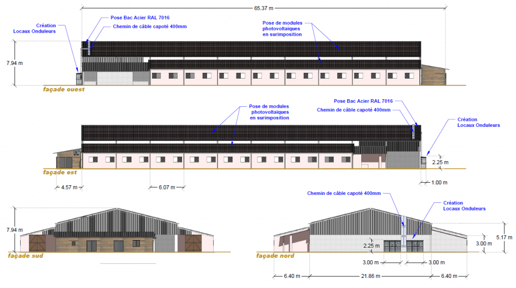 Pour les projets de bâtiment photovoltaïque, Calexia propose de financer et de construire les fondations, la structure du bâtiment, sa toiture en bac acier et la centrale photovoltaïque. Quant au bénéficiaire du bâtiment, il devra seulement réaliser les aménagements nécessaires à la mise en place du chantier comme le terrassement et l’accès, la gestion des eaux pluviales et le bardage selon la conception du projet défini en amont.